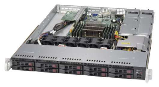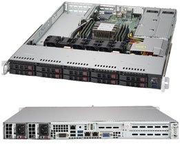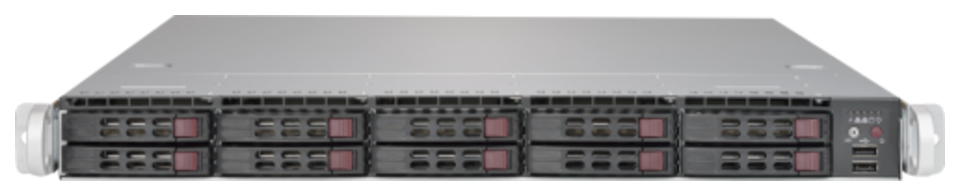 2つの10GBASE-T LANポートを搭載しているので、現代のデータセンターで要求される通信性能を満たし、様々なネットワーク構成に対応可能です。前面に10個の2.5インチドライブベイを搭載し、最大10台のSSDドライブを搭載可能です。これらのドライブベイはホットスワップ対応であるので、ドライブの故障時には本体の電源を切断することなく、ドライブの交換が可能です。