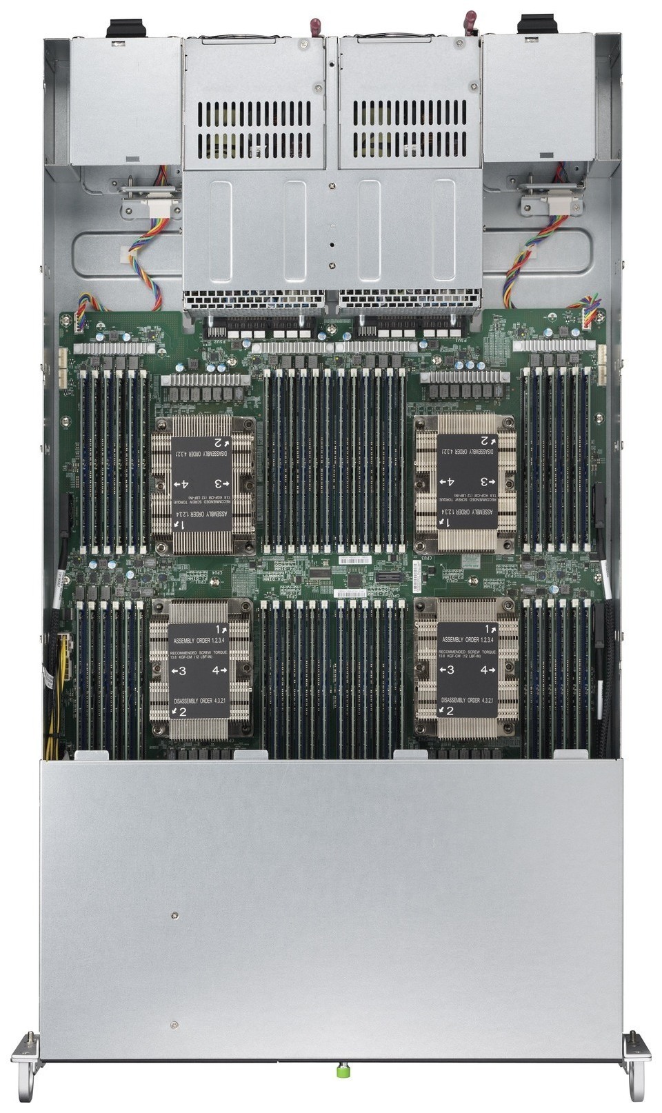 2つの2090W電源からなる冗長化電源を搭載し、万が一、一方の電源が故障した場合にもシステムの電源を切断することなく交換が可能です。また、Baseboard Management Controller(BMC)チップを搭載しているので、遠隔地からLAN経由での電源投入、強制再起動、LAN経由でのコンソール操作などが可能です。