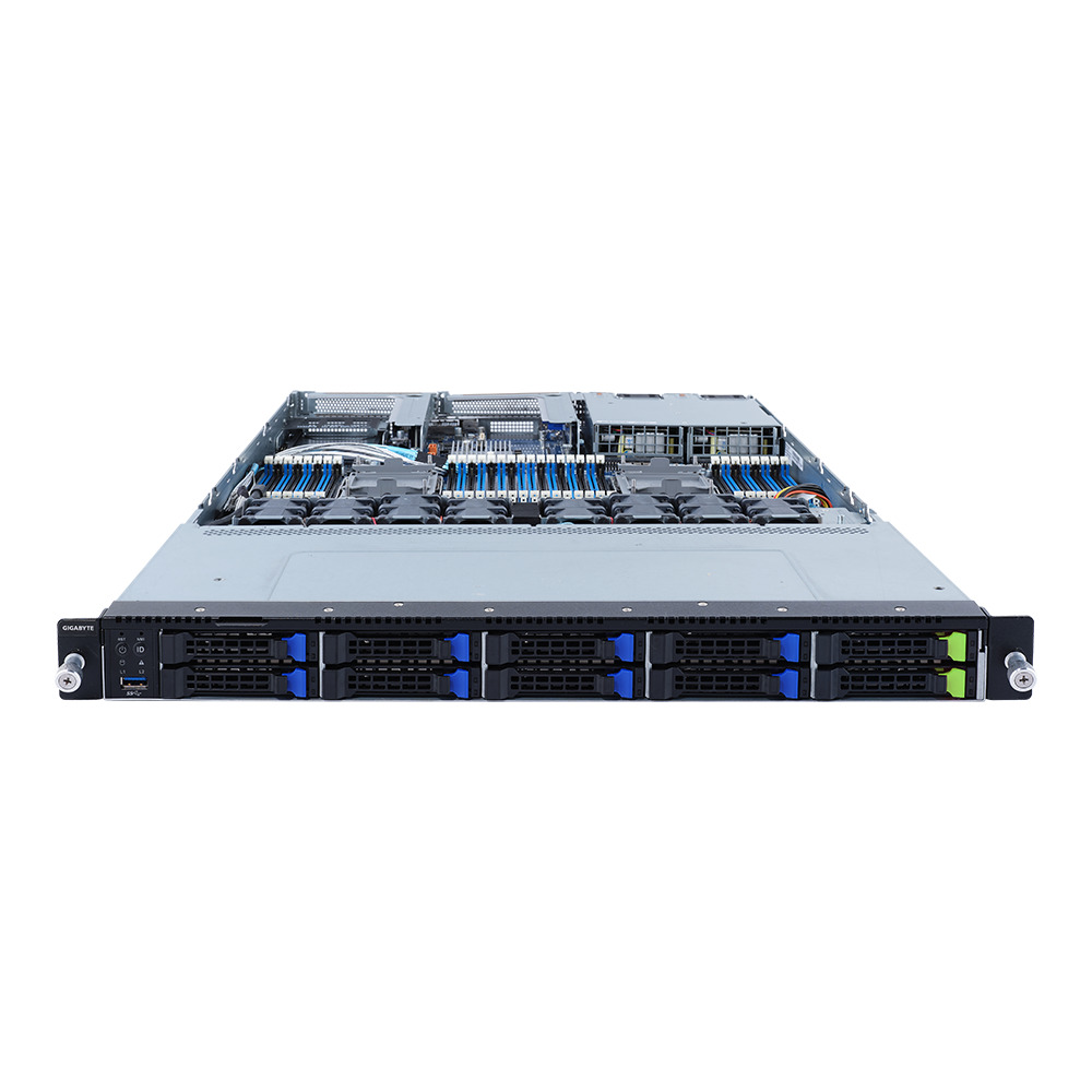 前面に10基の2.5インチドライブベイを搭載、最大10台のSATA SSDドライブを搭載可能です。これらのドライブベイはホットスワップに対応、ドライブの故障時に本体の電源を切断することなく、ドライブの交換が可能です。10基のドライブベイのうち2基にはNVMeドライブを搭載することも可能です。